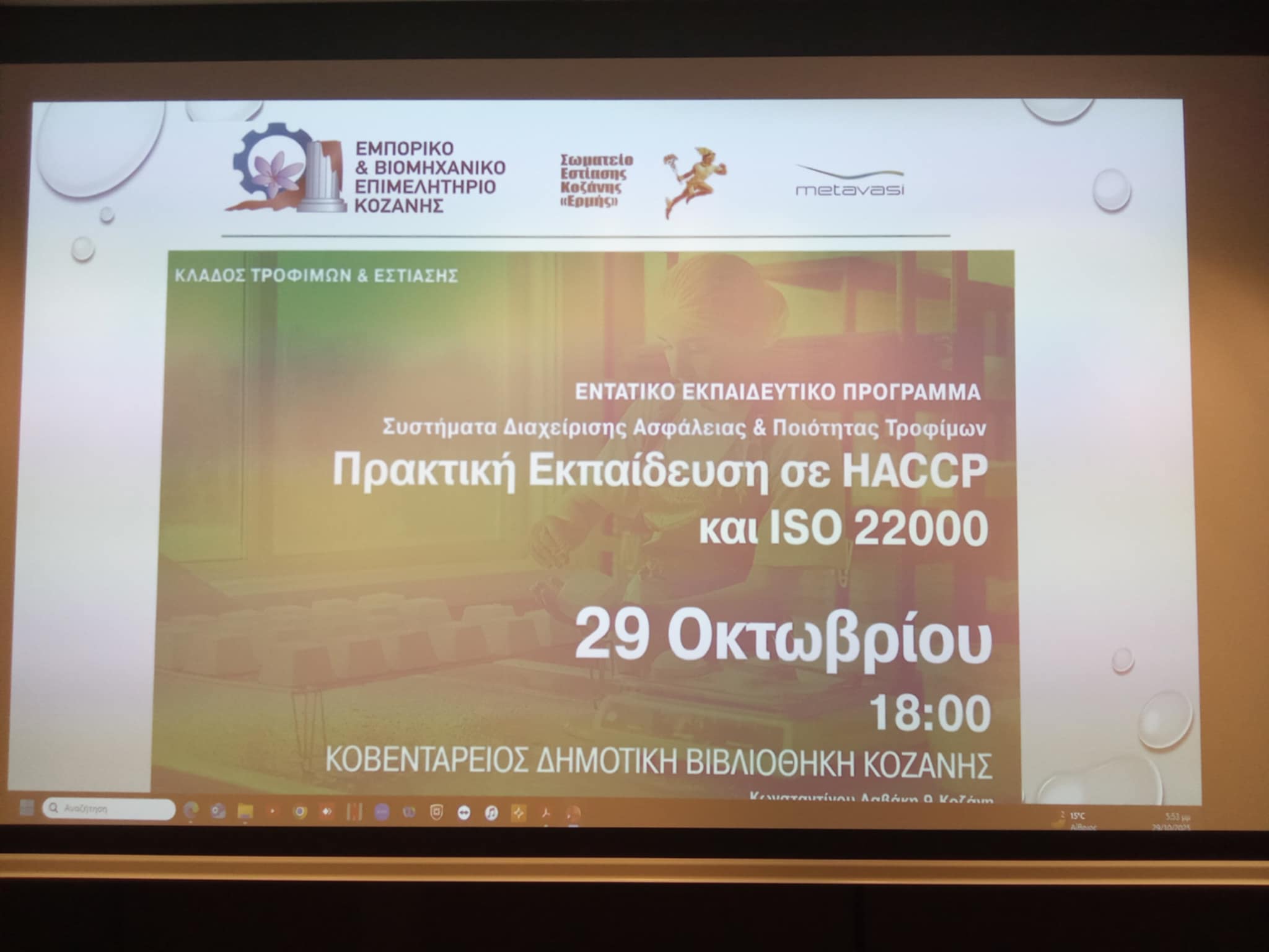 Με ιδιαίτερη επιτυχία πραγματοποιήθηκε την Τετάρτη 29 Οκτωβρίου 2025, στην Κοβεντάρειο Δημοτική Βιβλιοθήκη Κοζάνης, το εντατικό εκπαιδευτικό πρόγραμμα με τίτλο «Πρακτική Εκπαίδευση σε HACCP και ISO 22000», που διοργάνωσε το Επιμελητήριο Κοζάνης, σε συνεργασία με το Σωματείο Εστίασης Κοζάνης «Ερμής» και την εταιρεία MΕΤΑΒΑΣΗ Μ.Α.Ε.