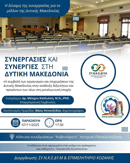 Με ιδιαίτερη επιτυχία πραγματοποιήθηκε την Παρασκευή 7 Νοεμβρίου 2025, στο Κοβεντάρειο Κοζάνης, η ημερίδα με θέμα «Συνεργασίες και Συνέργειες στη Δυτική Μακεδονία», που διοργανώθηκε από τον Σύνδεσμο Νέων Καινοτόμων Επιχειρηματιών και Ερευνητών Δυτικής Μακεδονίας (ΣΥΝ.ΚΕ.ΔΥ.Μ.) σε συνεργασία με το Επιμελητήριο Π.Ε. Κοζάνης.