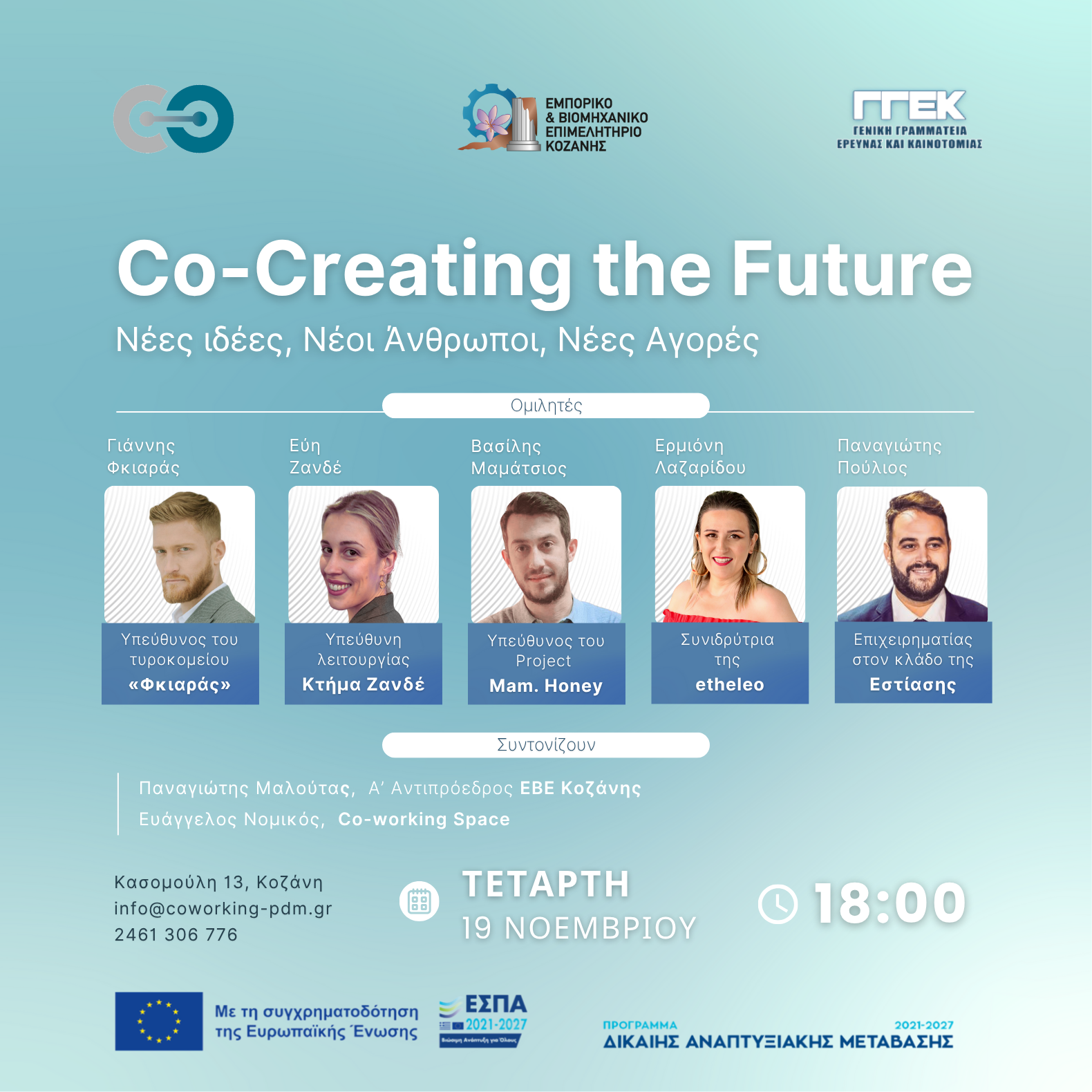 ΕΠΙΚΑΙΡΟΤΗΤΑ - Co-Creating the Future: Νέες Ιδέες, Νέοι Άνθρωποι, Νέες Αγορές Τετάρτη 19 Νοεμβρίου 2025, 18:00 | Συνεργατικός Χώρος Εργασίας Δυτικής Μακεδονίας, Κασομούλη 13, Κοζάνη