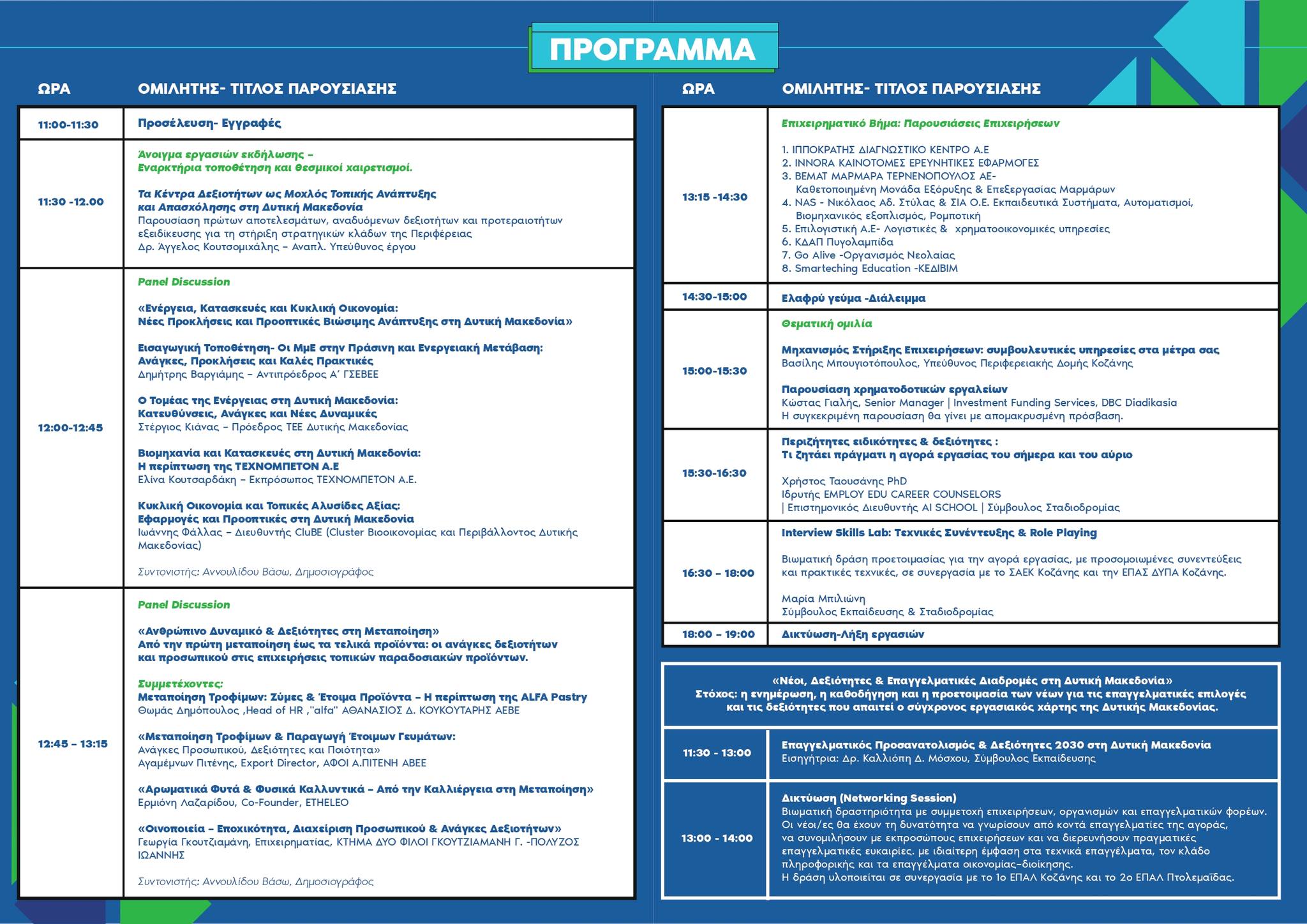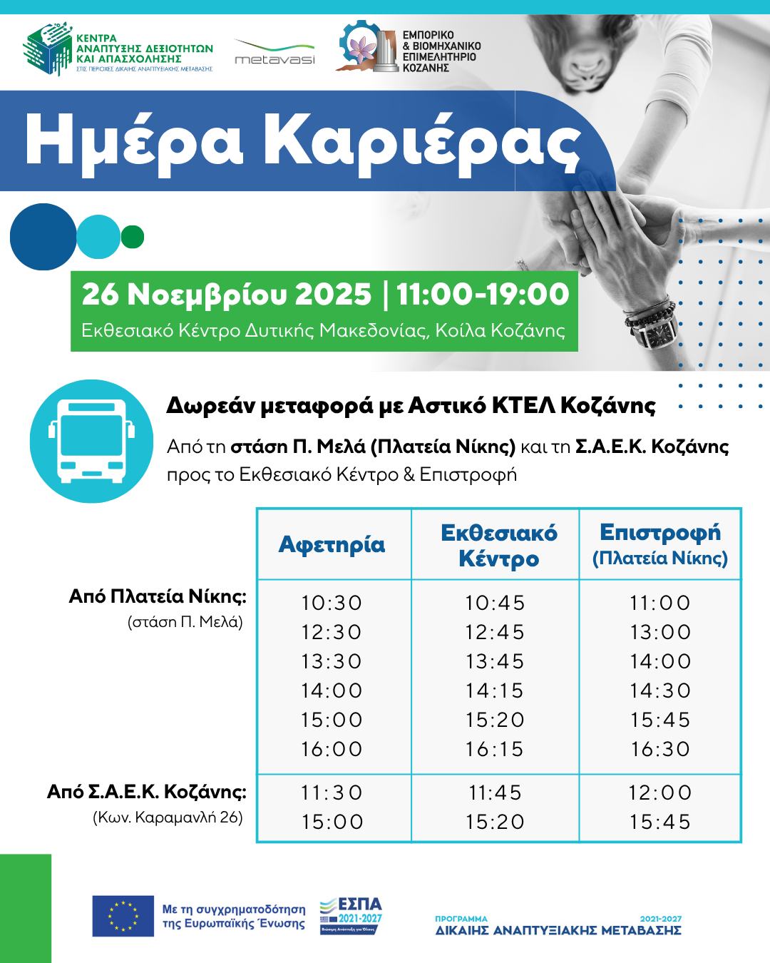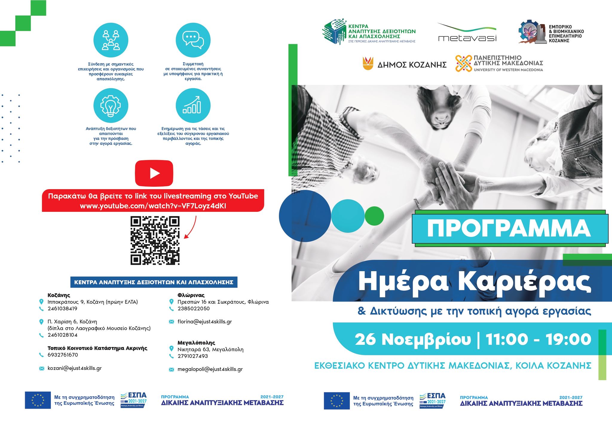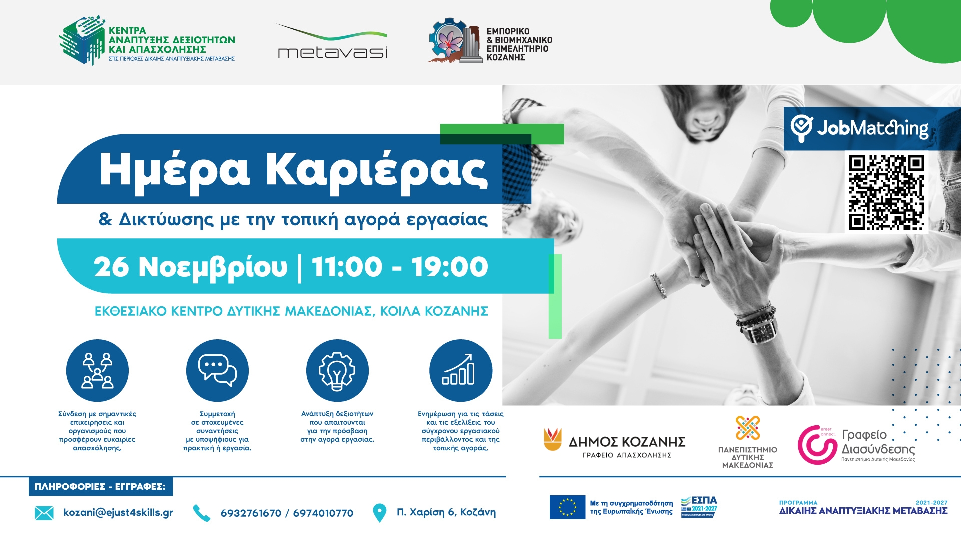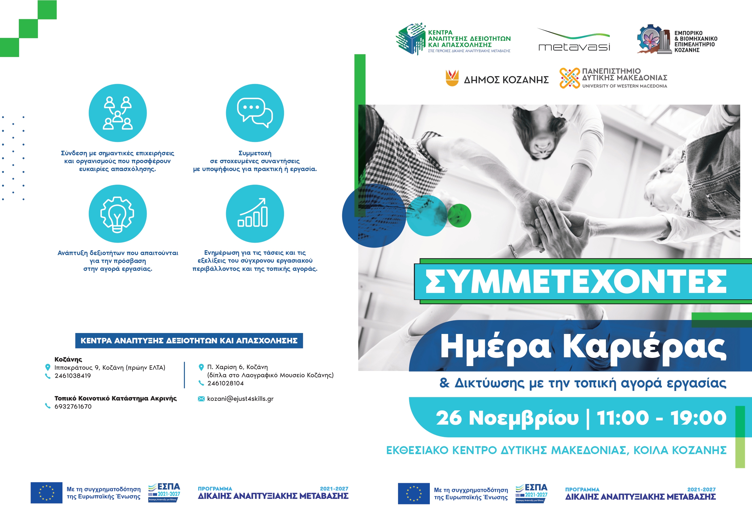 Τα Κέντρα Ανάπτυξης Δεξιοτήτων και Απασχόλησης, η ΜΕΤΑΒΑΣΗ Α.Ε., το Επιμελητήριο Κοζάνης, το Πανεπιστήμιο Δυτικής Μακεδονίας και ο Δήμος Κοζάνης διοργανώνουν την «Ημέρα Καριέρας & Δικτύωσης» που θα πραγματοποιηθεί την Τετάρτη 26 Νοεμβρίου και ώρα 11:00 – 19:00 στο Εκθεσιακό Κέντρο Δυτικής Μακεδονίας στα Κοίλα Κοζάνης, και προσκαλούν κάθε ενδιαφερόμενο, να προσέλθει και να αναζητήσει ευκαιρίες εργασίας αλλά και να παρακολουθήσει ενδιαφέρουσες θεματικές συζητήσεις και workshops.