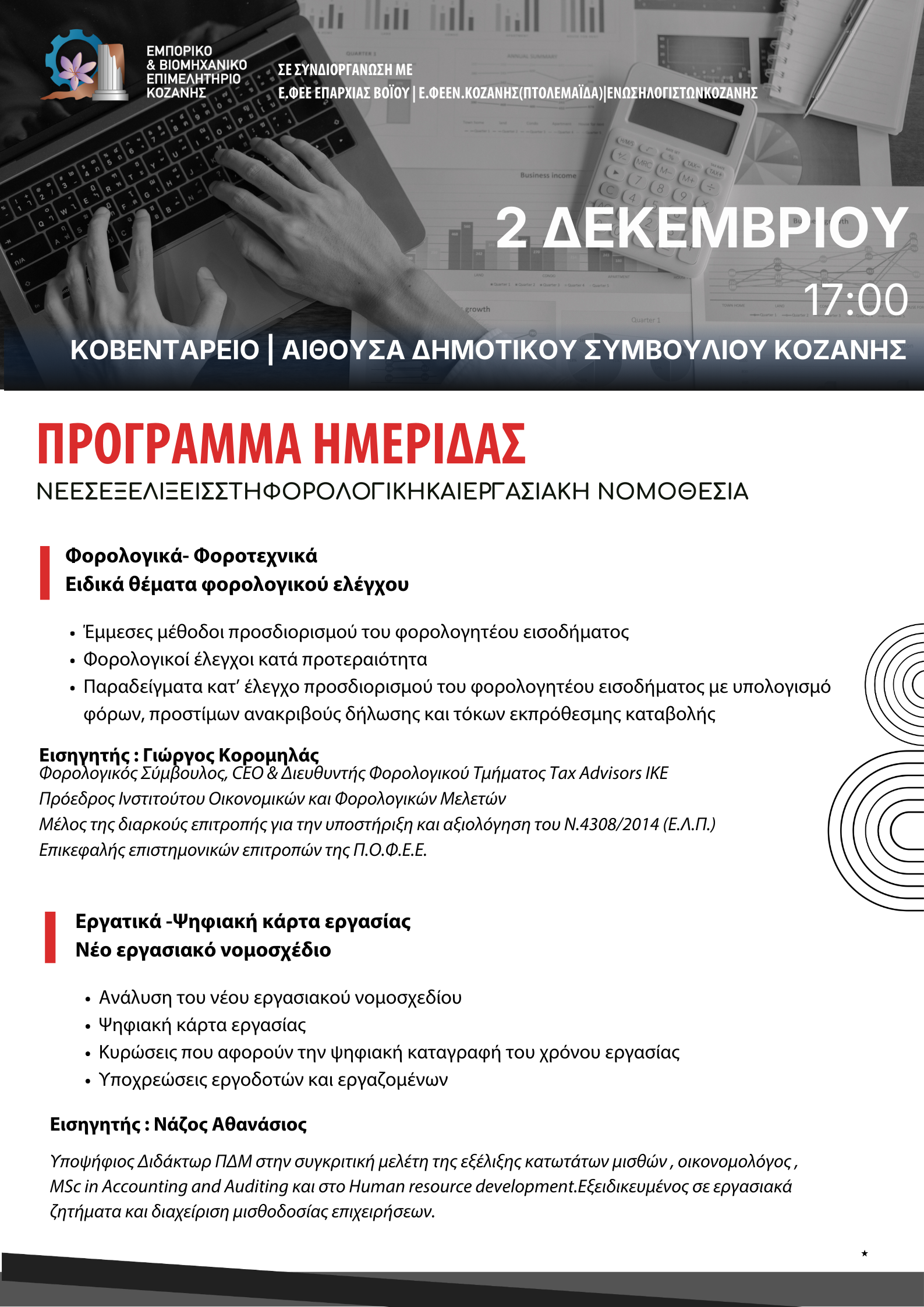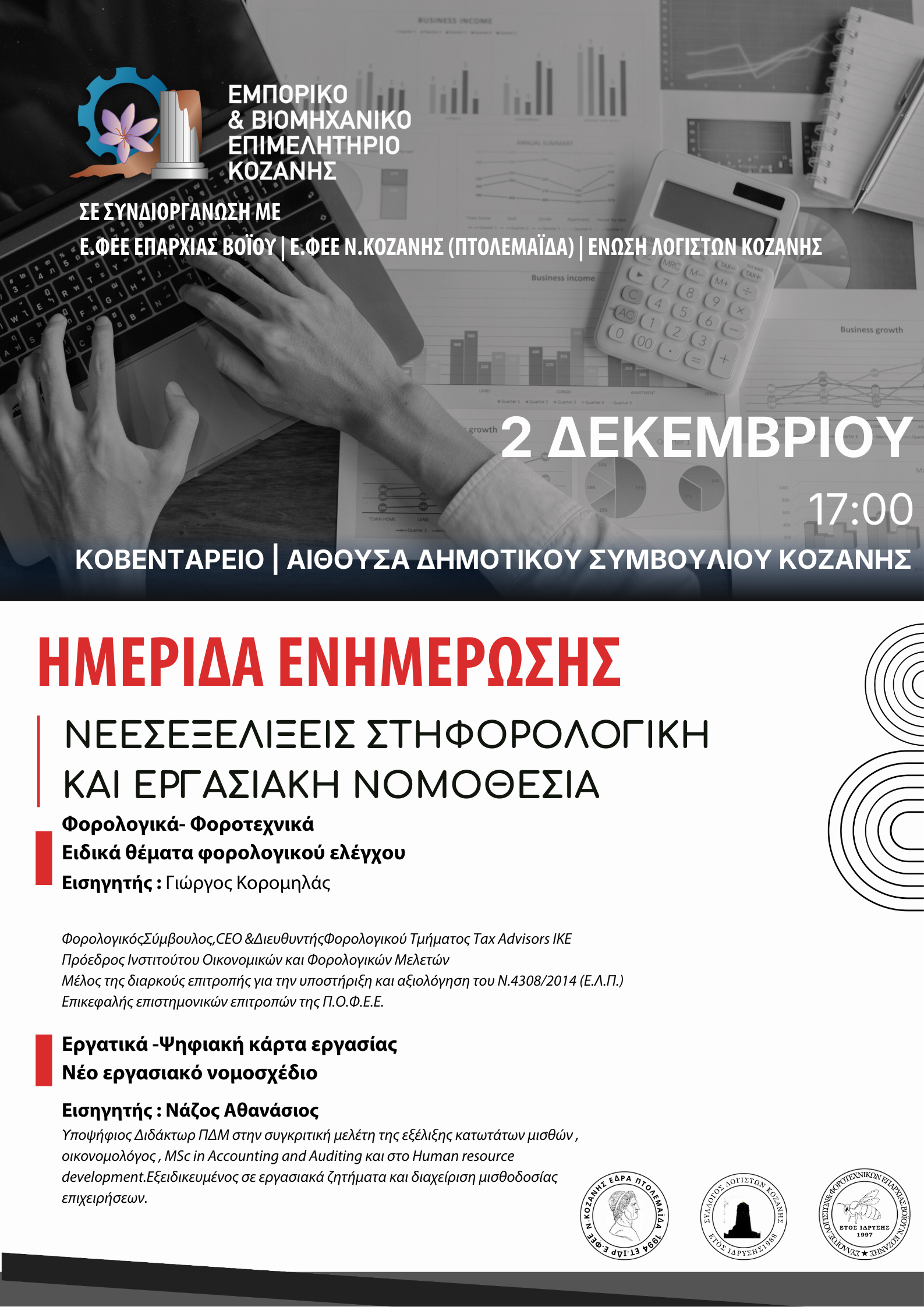 Ενημερωτική ημερίδα με θέμα: «Νέες Εξελίξεις στη Φορολογική και Εργασιακή Νομοθεσία» την Τρίτη 2 Δεκεμβρίου, ώρα 17:00 στην Αίθουσα Συνεδριάσεων του Δημοτικού Συμβουλίου Κοζάνης στο Κοβεντάρειο