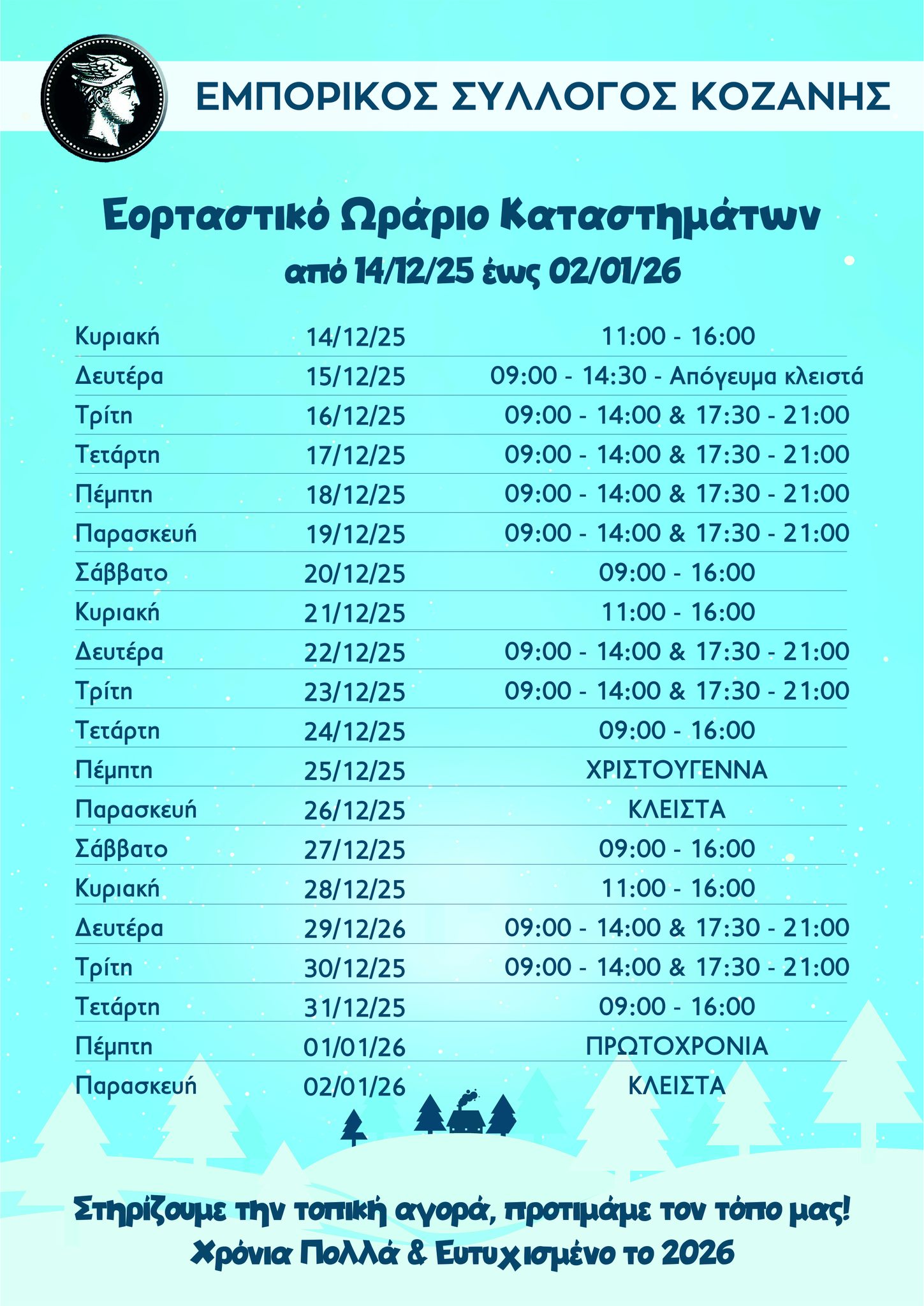 Ο Εμπορικός Σύλλογος Κοζάνης - Εορταστικό Ωράριο Καταστημάτων