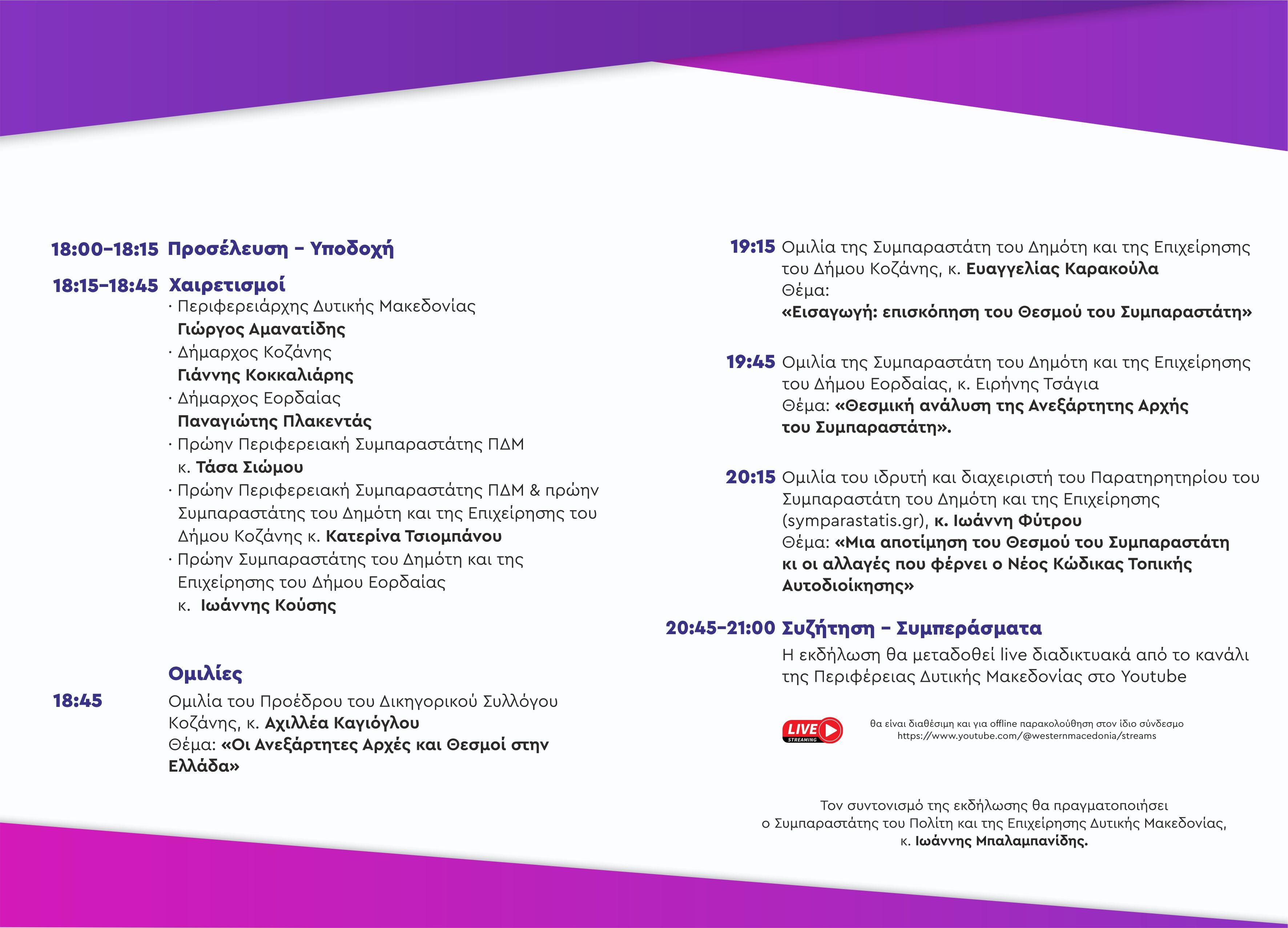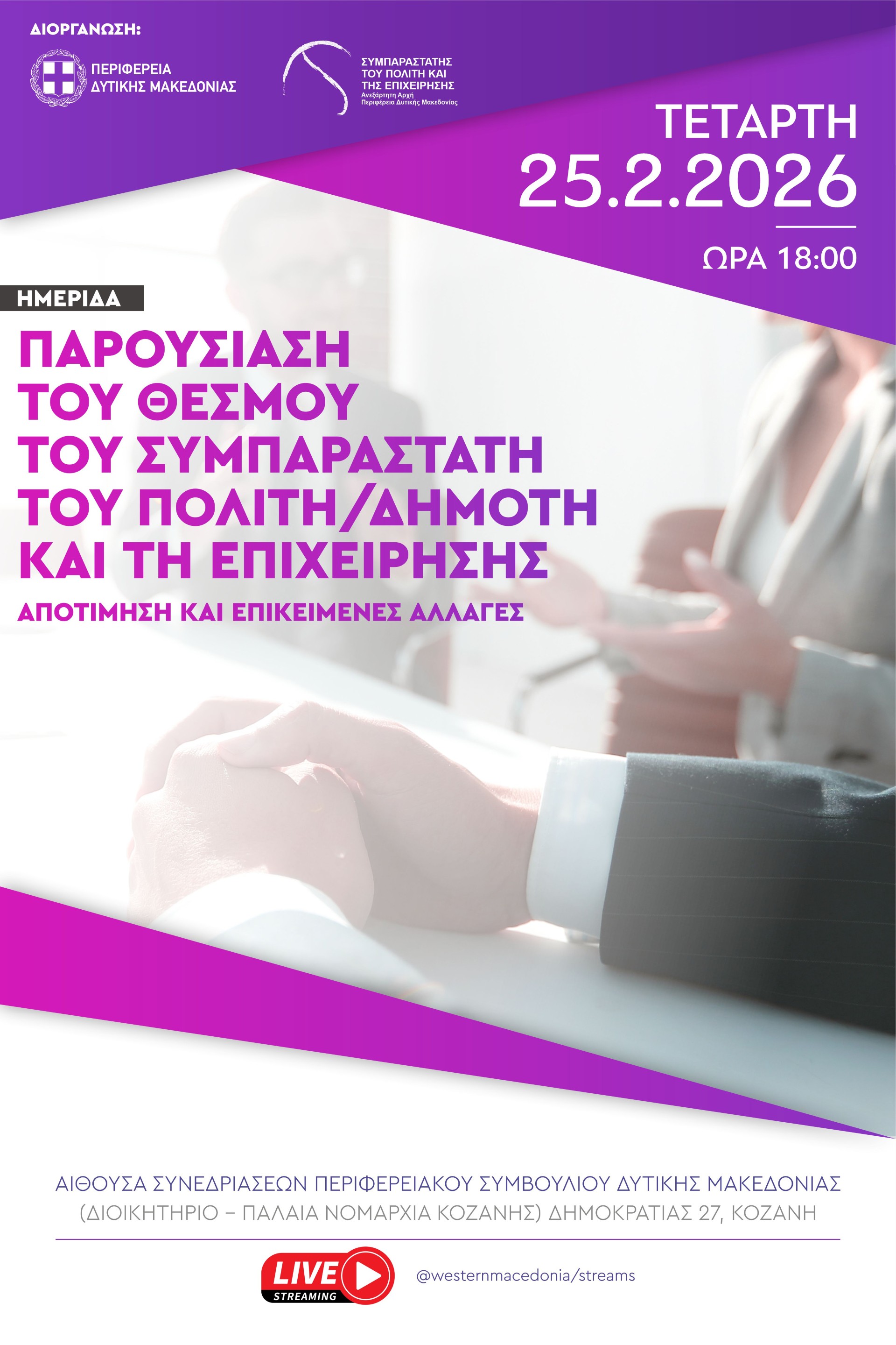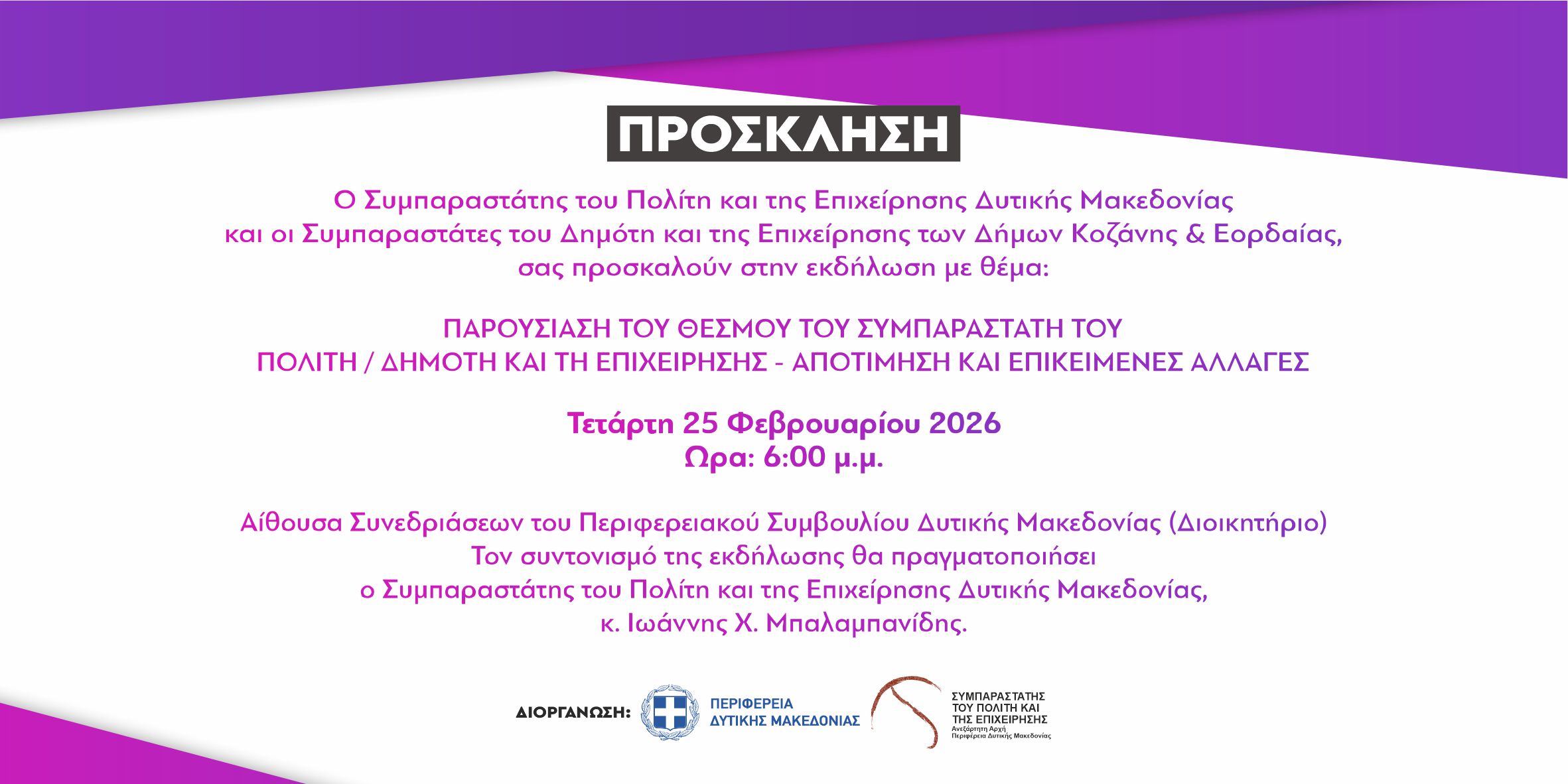 Ο Συμπαραστάτης του Πολίτη και της Επιχείρησης Δυτικής Μακεδονίας και οι Συμπαραστάτες του Δημότη και της Επιχείρησης των Δήμων Κοζάνης & Εορδαίας, σας προσκαλούν στην εκδήλωση με θέμα: