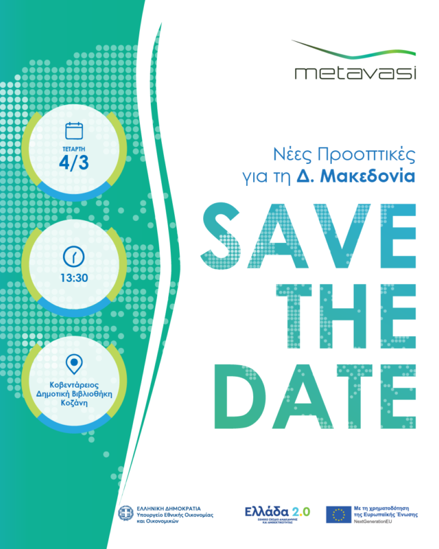 Η Ελληνική Εταιρεία Δίκαιης Αναπτυξιακής Μετάβασης (ΜΕΤΑΒΑΣΗ Μ.Α.Ε.) διοργανώνει εκδήλωση στην Κοζάνη, στο πλαίσιο του έργου «Δράσεις αναζωογόνησης των περιοχών που έχουν πληγεί περισσότερο (Περιοχές υπό Μετάβαση)», με κωδικό MIS TAA 5184975, που χρηματοδοτείται από το Ταμείο Ανάκαμψης και Ανθεκτικότητας (ΤΑΑ).