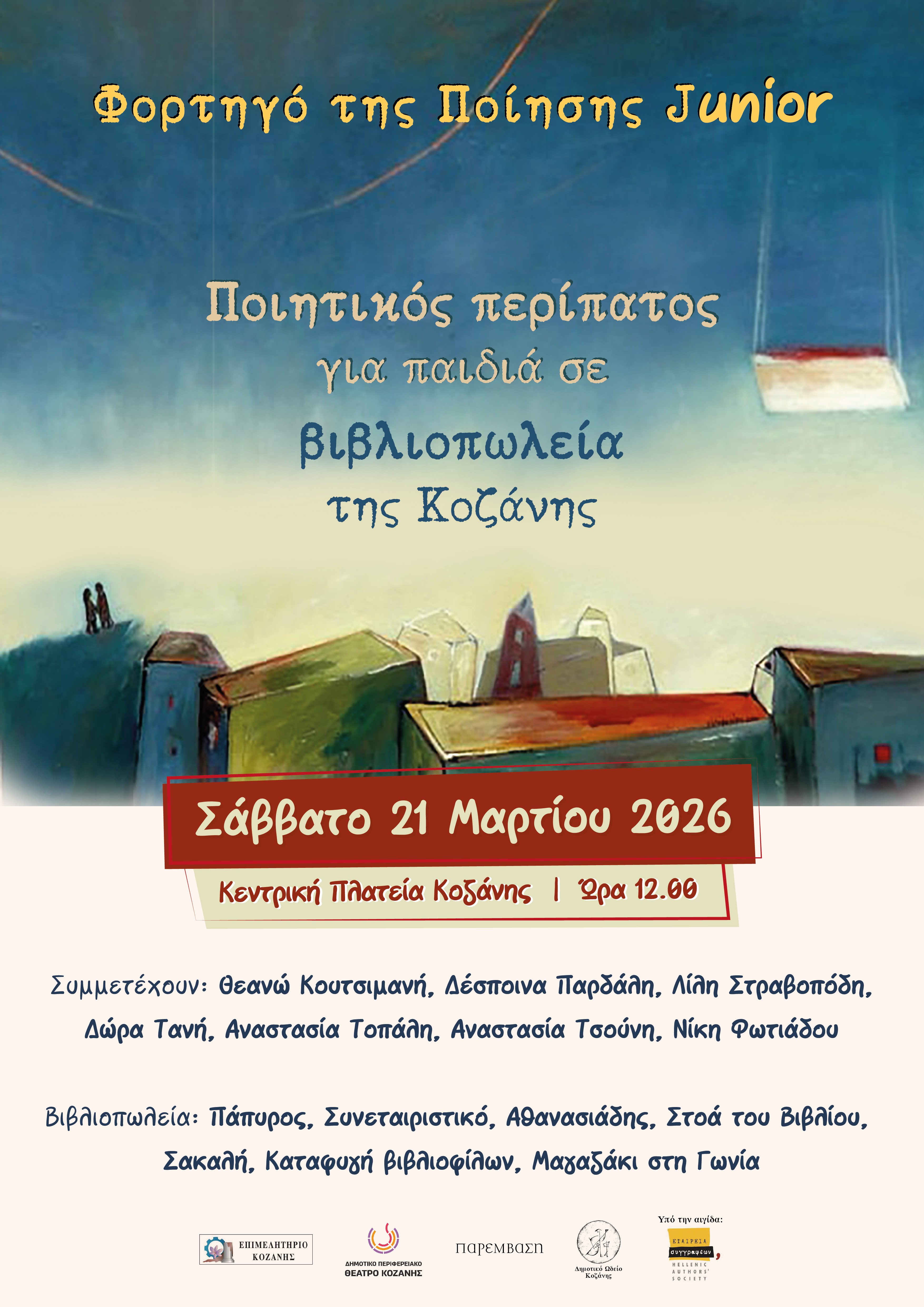 Στο πλαίσιο των εκδηλώσεων για την Παγκόσμια Ημέρα Ποίησης, η Κοζάνη υποδέχεται μια ξεχωριστή δράση αφιερωμένη στα παιδιά:«Το Φορτηγό της Ποίησης Junior». Το Σάββατο 21 Μαρτίου, με ώρα συνάντησης 12.00 στην Κεντρική πλατεία της Κοζάνης, οι μικροί μας φίλοι θα συμμετάσχουν σε ένα ποιητικό περίπατο σε βιβλιοπωλεία της πόλης -Πάπυρος, Συνεταιριστικό, Αθανασιάδης, Στοά του Βιβλίου, Σακαλής, Καταφυγή Βιβλιοφίλων, Μαγαζάκι στη Γωνία-, μετατρέποντας την πόλη σε έναν ζωντανό χάρτη ποίησης. Σε κάθε στάση, αφηγητές και μουσικοί θα ζωντανέψουν ποιήματα για παιδιά σε μια διαδρομή γεμάτη λόγο, ήχο και φαντασία.