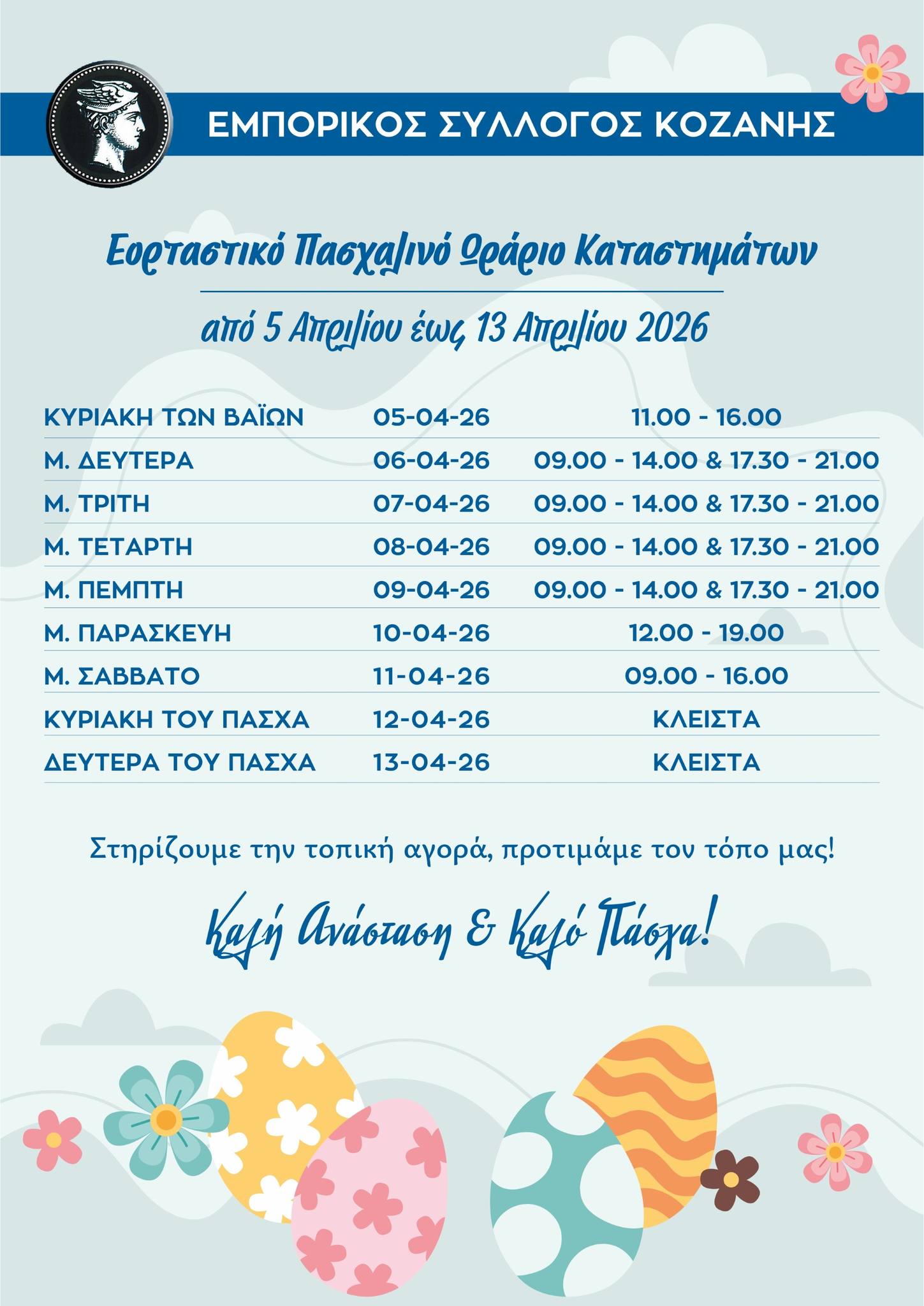 Ο Εμπορικός Σύλλογος Κοζάνης ανακοινώνει το εορταστικό ωράριο των καταστημάτων κατά την περίοδο του Πάσχα. Ευχόμαστε καλές δουλειές σε όλους τους συναδέλφους, μία περίοδο που όλοι την περιμένουμε για να ανακάμψει η κίνηση στην Αγορά μας. Επίσης υγεία αλλά και ειρήνη που τόσο πολύ τη χρειάζεται ο κόσμος. Καλή και Ευλογημένη Ανάσταση!
