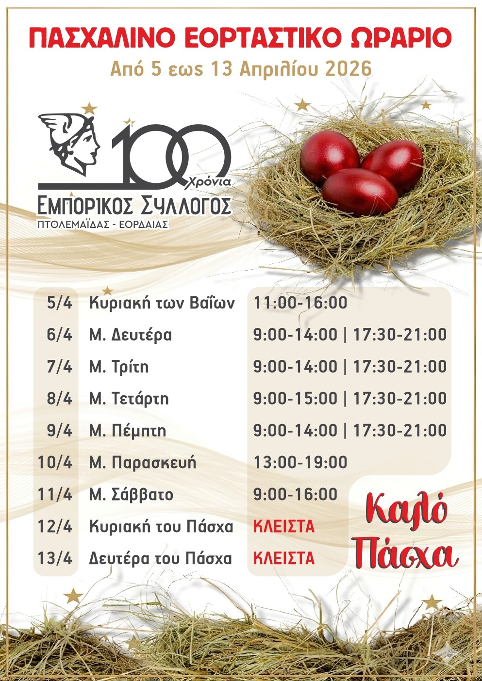 ΕΠΙΚΑΙΡΟΤΗΤΑ - Εμπορικός Σύλλογος Πτολεμαϊδας - Εορταστικό Πασχαλινό Ωράριο Καταστημάτων
