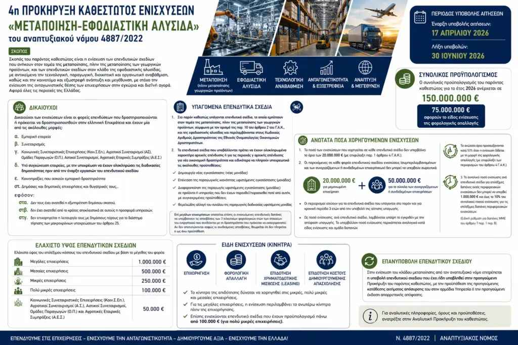 Η προθεσμία υποβολής αιτήσεων για όλα τα καθεστώτα είναι η 30η Ιουνίου 2026, με συνολικό προϋπολογισμό 450 εκατ. ευρώ ενώ ο προϋπολογισμός κάθε καθεστώτος ανέρχεται στα 150 εκατ. ευρώ.