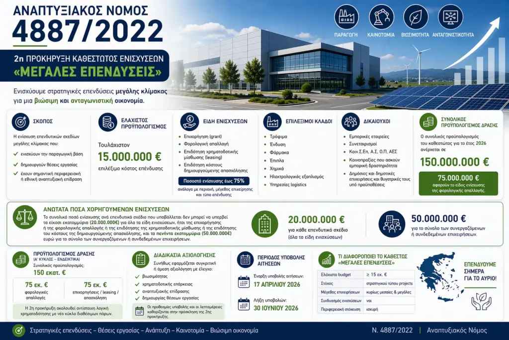 Τα τρία καθεστώτα του Αναπτυξιακού Νόμου παρέχουν επιδοτήσεις για επενδυτικά έργα στη Μεταποίηση, για Μεγάλες επενδύσεις και Επενδύσεις σε περιοχές Ειδικής Ενίσχυσης, όπως αυτές έχουν καθορισθεί.